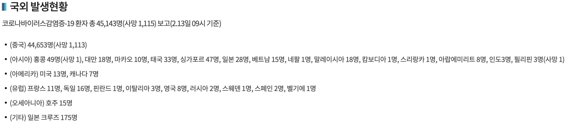 2월 13일 9시 기준 코로나바이러스감염증-19의 전 세계 환자수는 45,143명입니다.