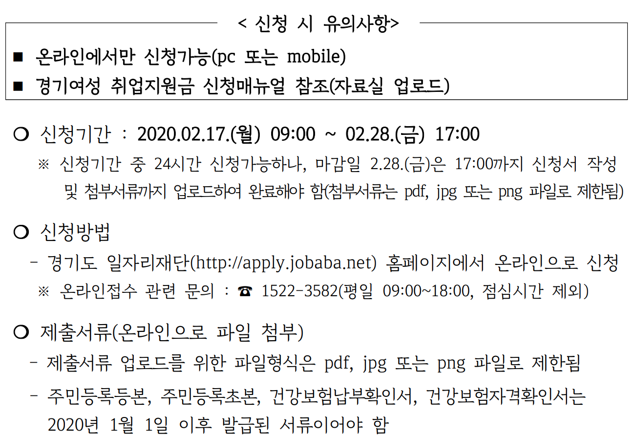 이번에는 경기여성 취업지원금 2차 신청(신청기간: 2020년 2월 17일 월 9시 ~ 2월 28일 금 17시)에 관한 글을 써보려고 합니다.