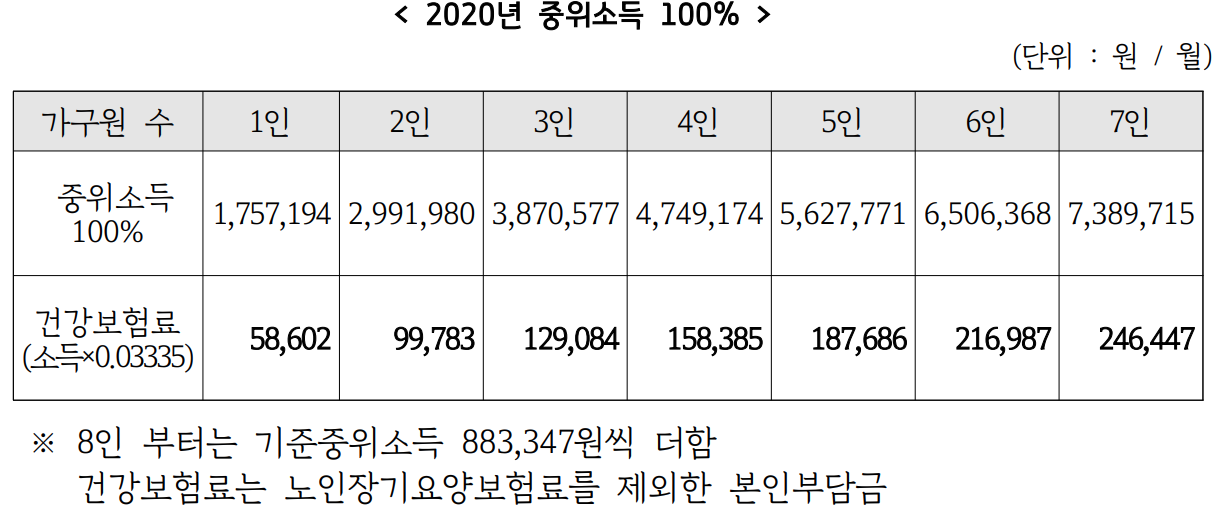(예를 들면 주민등록상 가족이 4인이고, 한달 건강보험료를 14만원을 내면 신청하실 수 있습니다. 왜냐하면 4인 건강보험료 기준이 158,385원이기 때문입니다.)