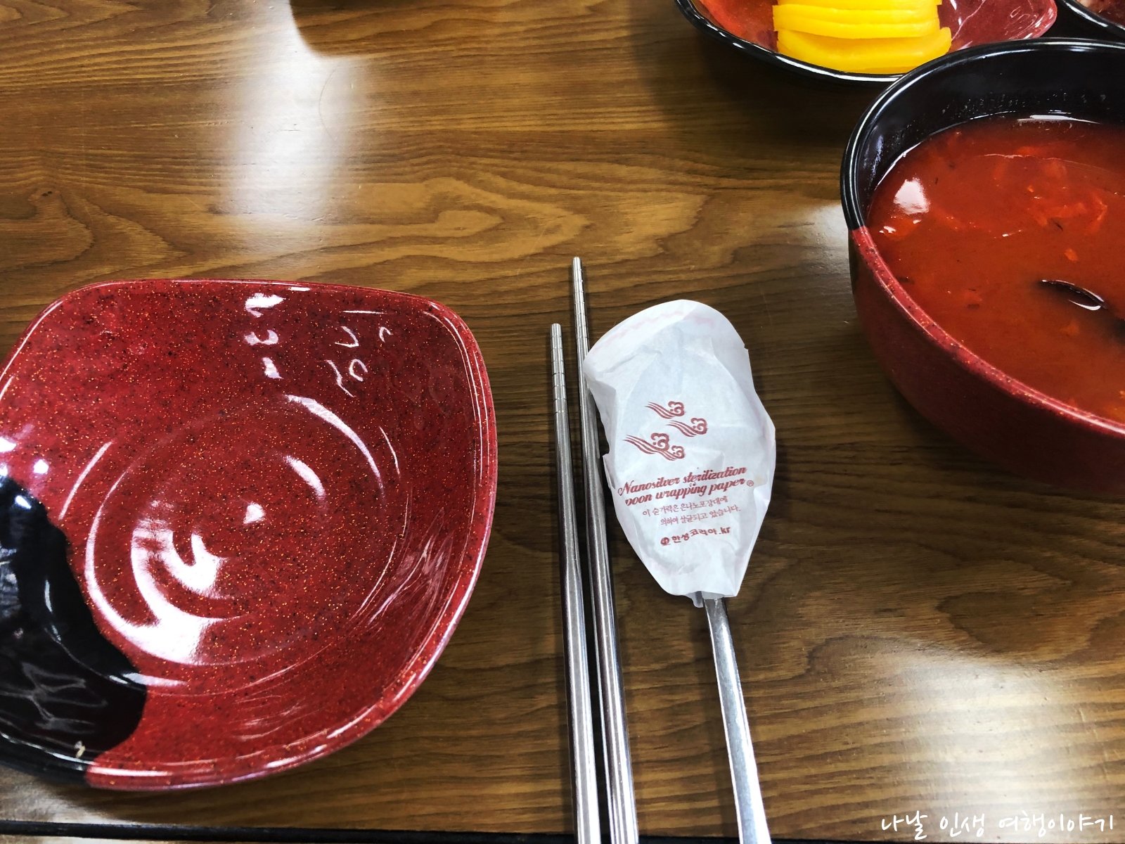 그릇이 깔끔합니다. 숟가락에 흰 종이를 씌어서 위생적입니다.