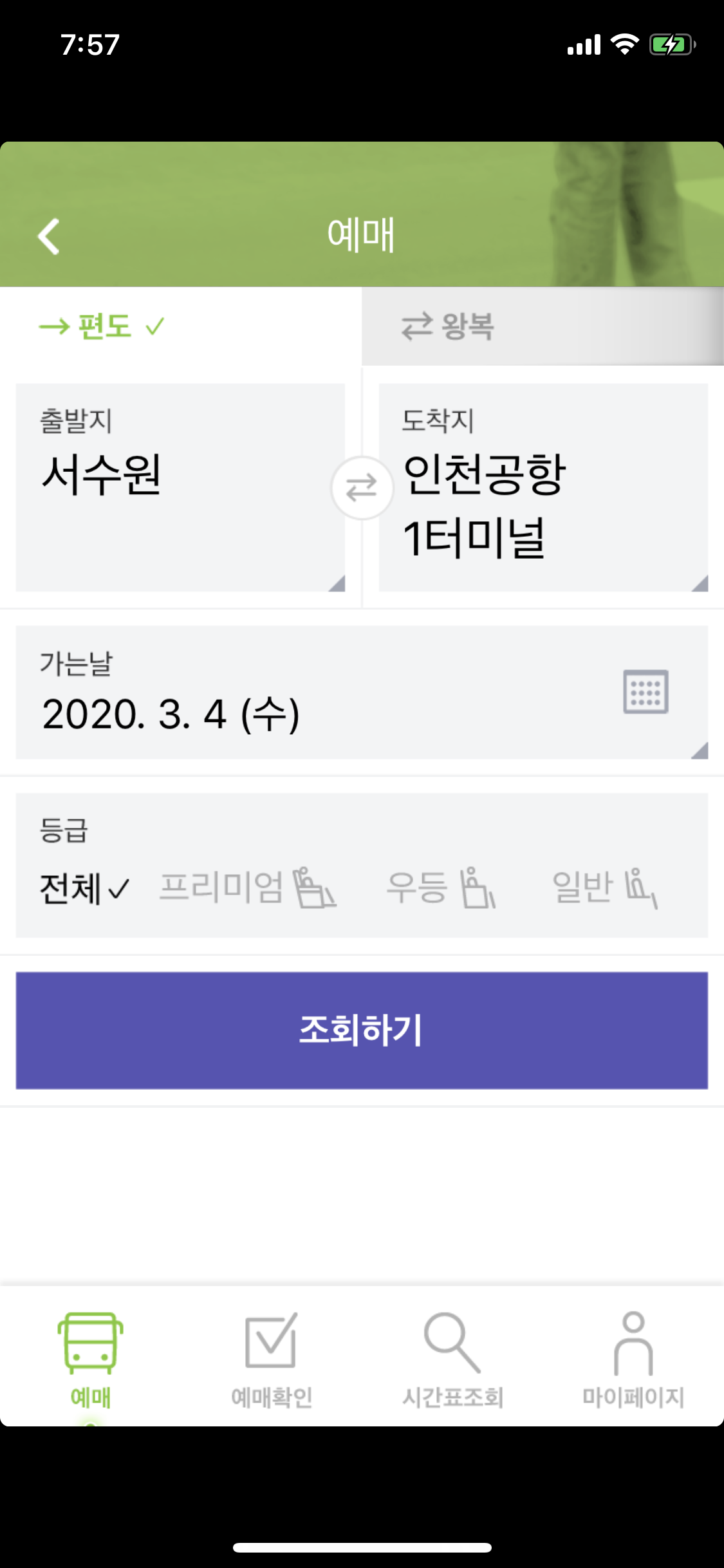 -시외버스티머니 앱에서 서수원터미널 출발, 인천공항 도착 버스 검색하기