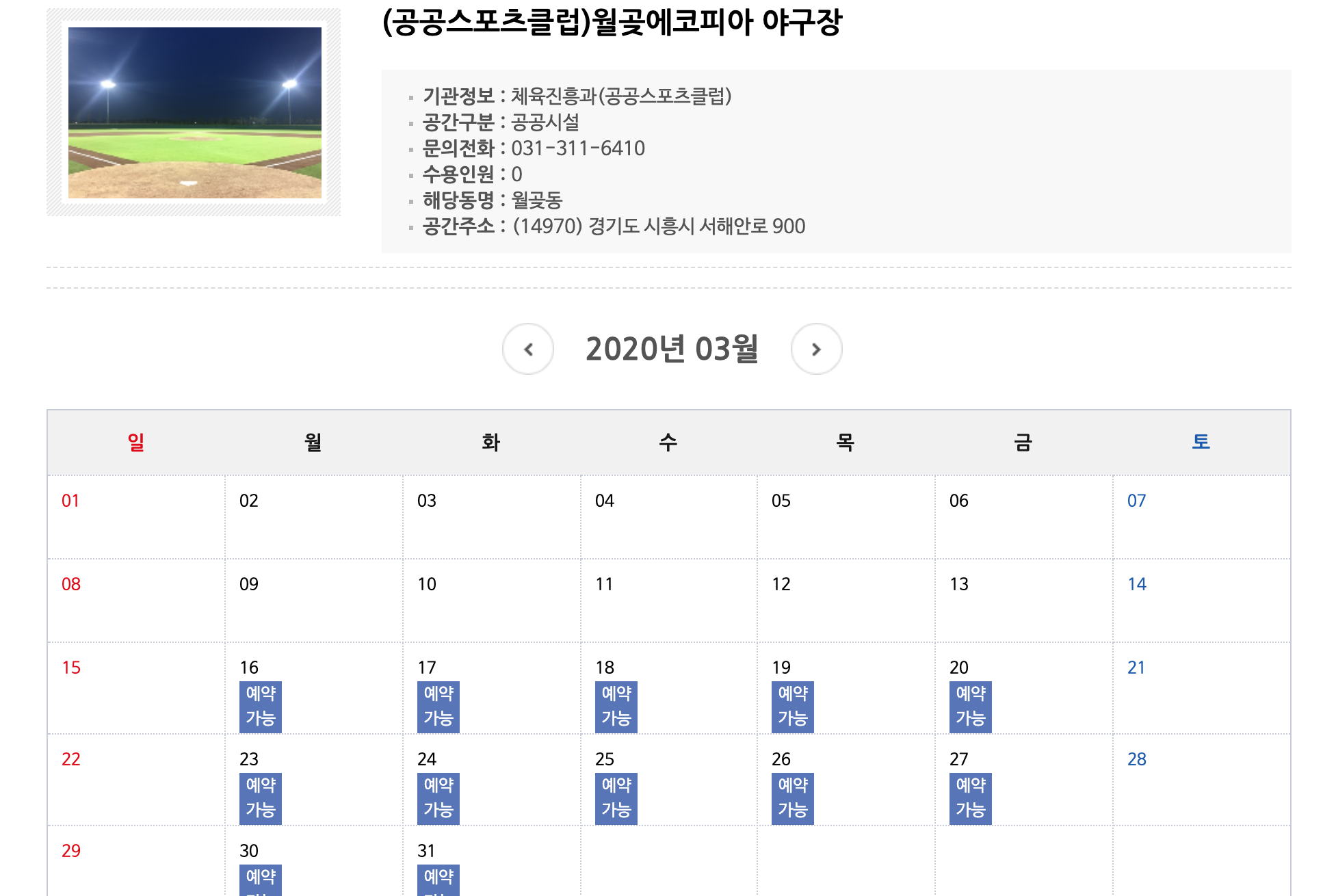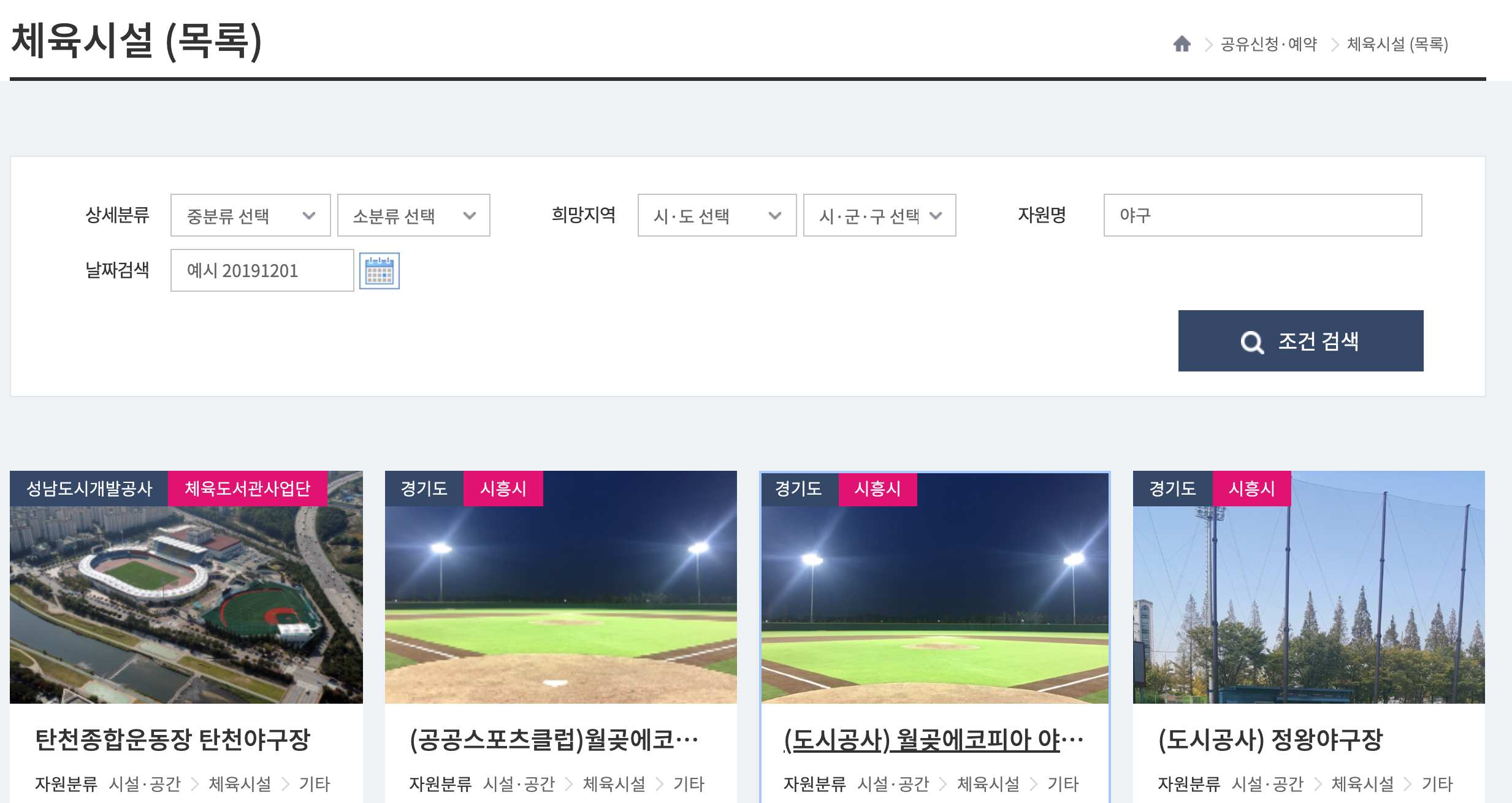체육시설에서 '야구'로 검색하였더니 아래 화면과 같이 검색이 됩니다.