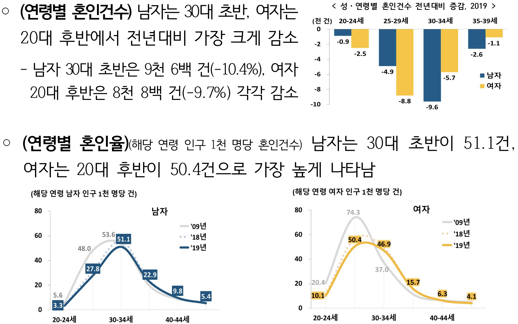 1) 연령별 혼인건수는 남자는 30대 초반, 여자는 20대 후반이 가장 크게 감소