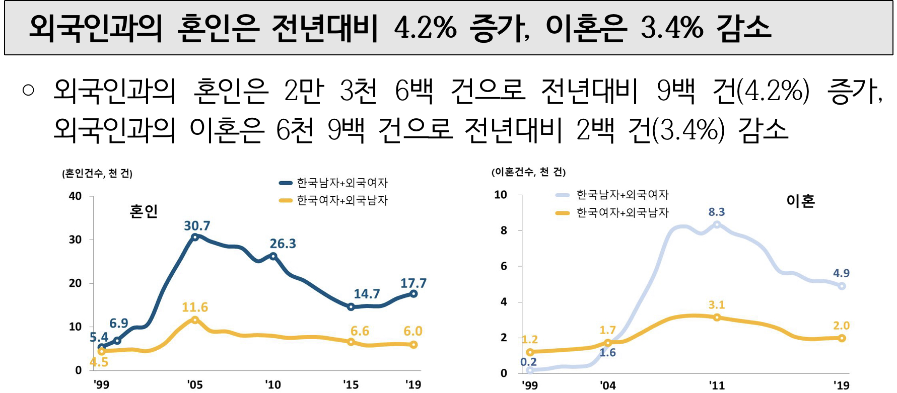 1) 외국인과 혼인: 23,600건(작년보다 900건 증가, 4.2% 상승)