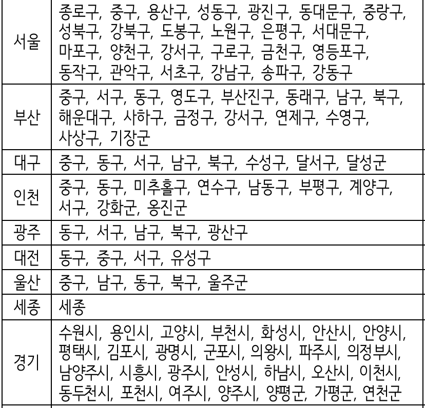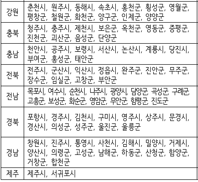 2) 전자상품권을 지급하는 구체적인 지역은 아래 표를 참조하세요.