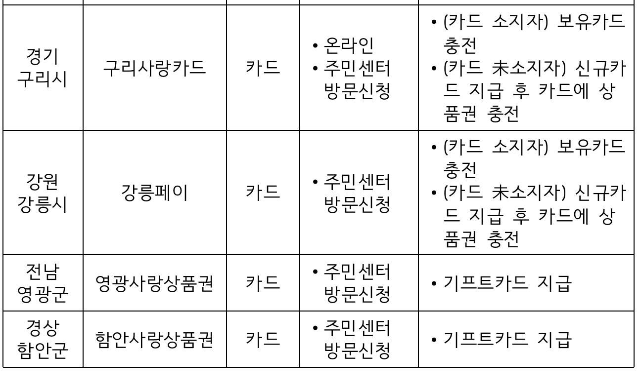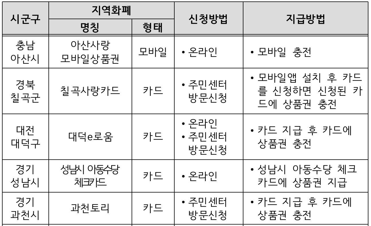 1) 전자화폐는 해당 시군구 마다 다르므로 안내에 따라 신청하셔야 합니다.