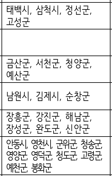 2) 종이상품권을 지급하는 구체적인 지역은 아래 표를 참조하세요.