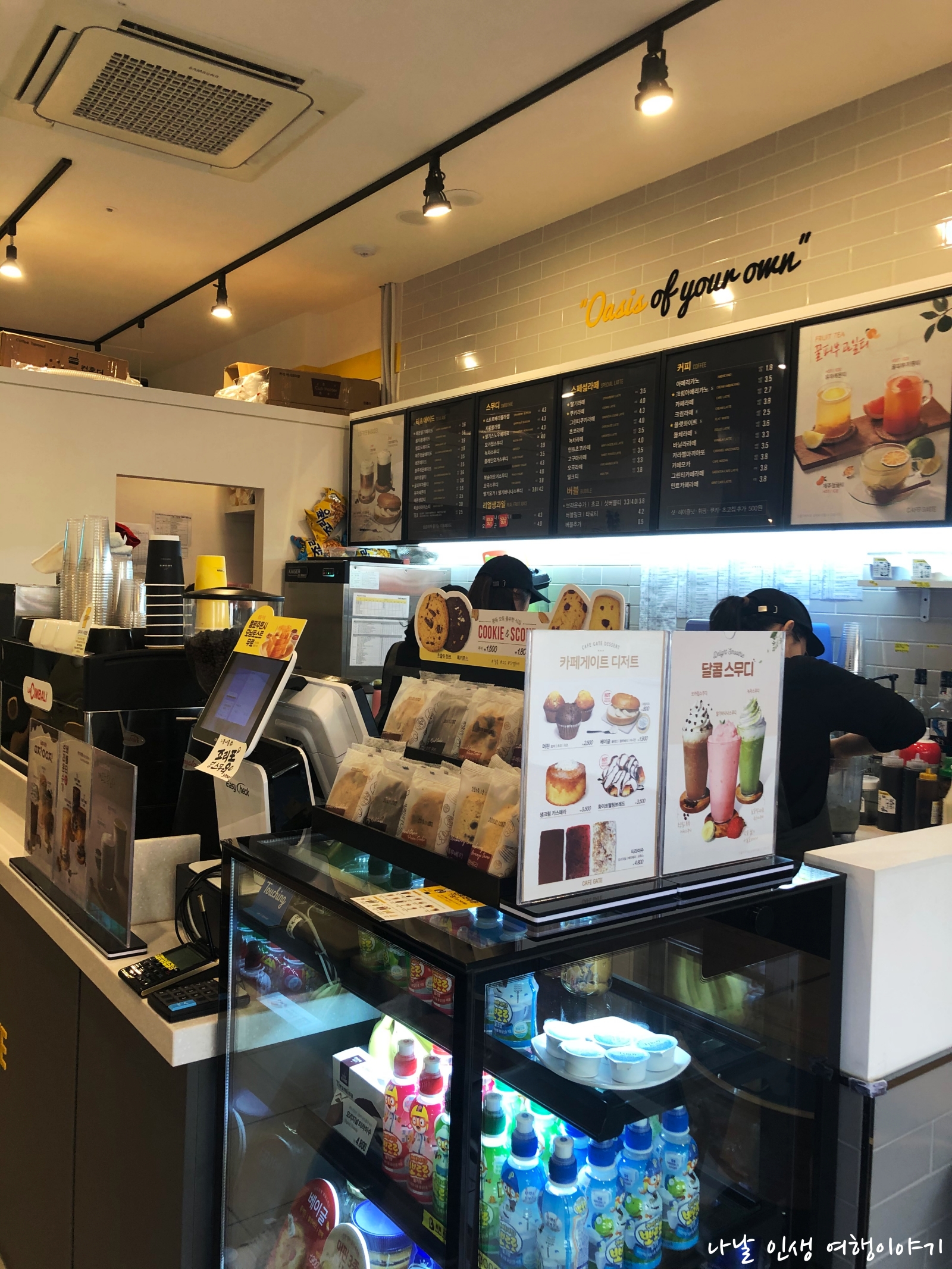 노란 비행기가 이륙하는 카페게이트의 로고가 귀엽습니다. 어두원 바탕에 노란색이 잘 어울립니다.