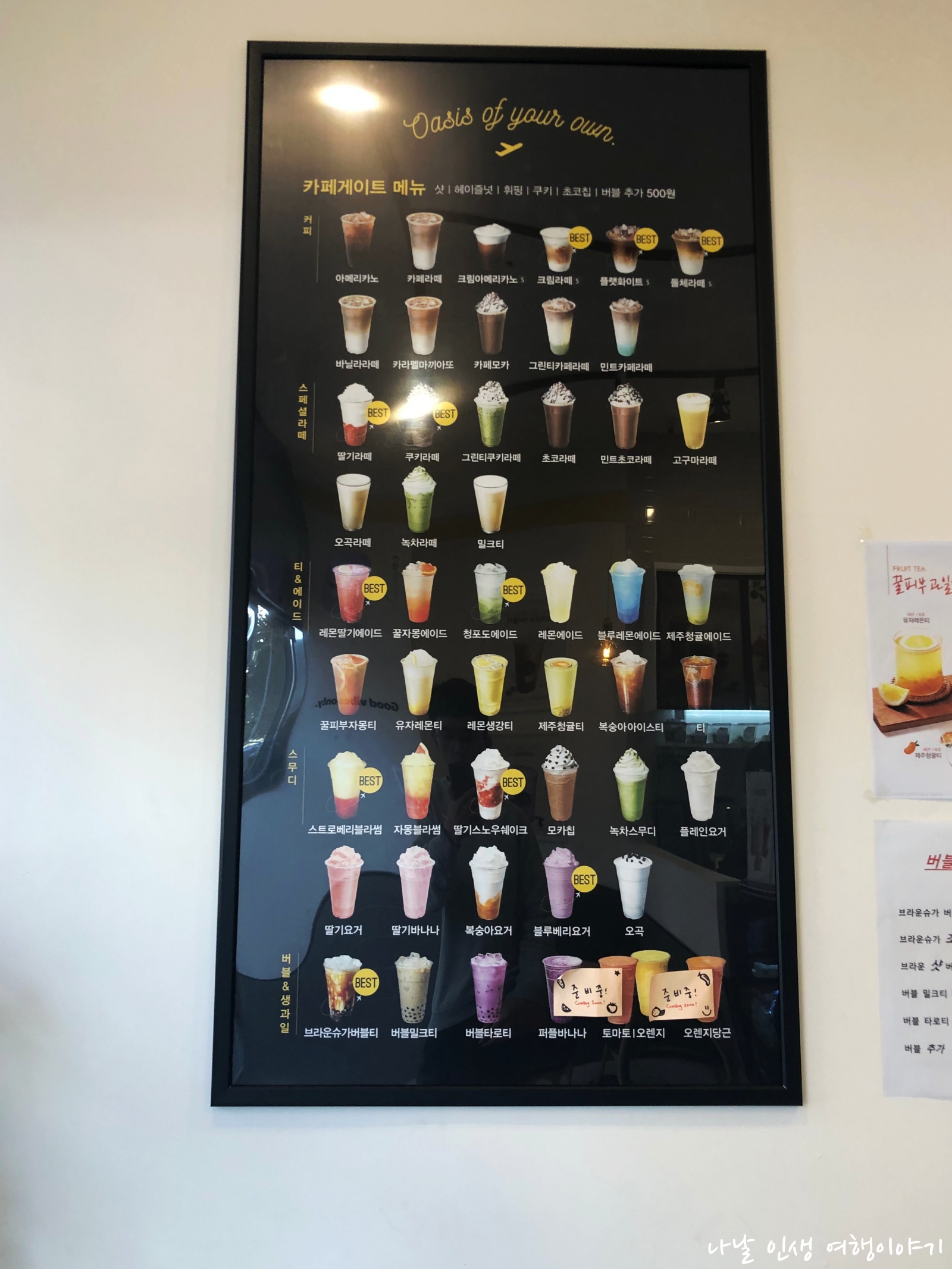 -(추측) 저는 먹지 않은 거라서 추측해 봅니다. 스무디 종류와 스페셜라떼 등 달달한 음료가 맛있을 것 같다는 생각입니다. 왜냐하면 카페에 앉아있으면 초등학생과 중학생들이 무척 많이 구매해서 먹는 것을 볼 수 있습니다.
