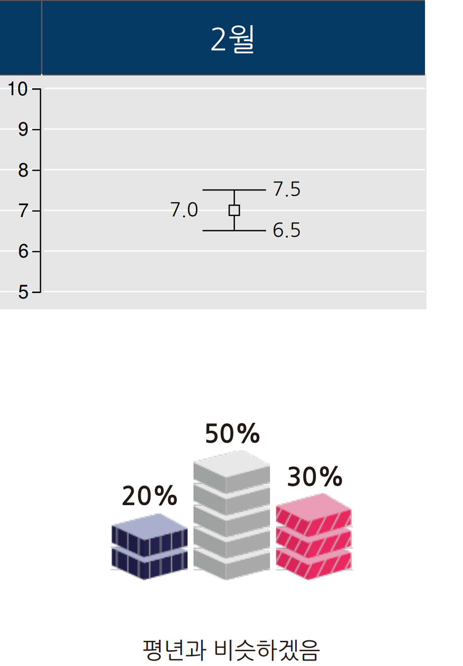 - (월평균기온) 평년(6.5~7.5℃)과 비슷할 확률이 50%입니다.