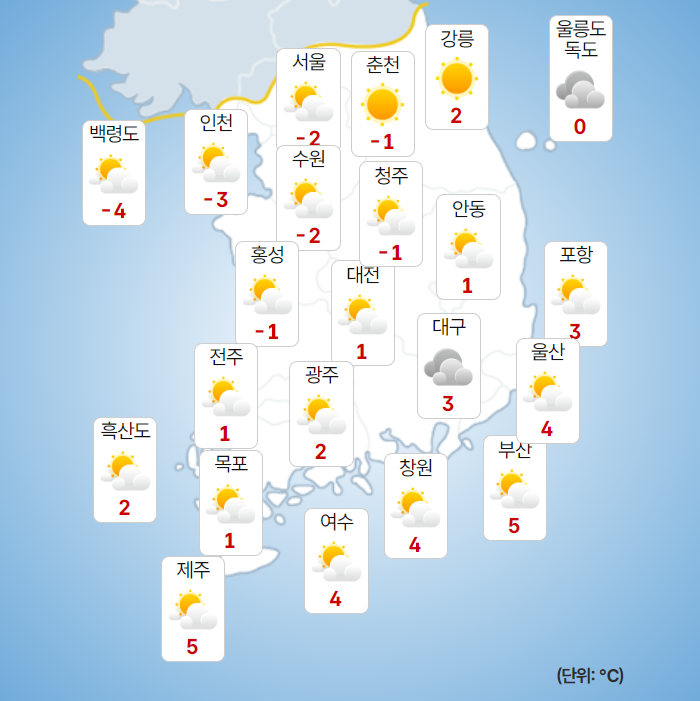 ▷ 당분간 기온은 평년(최저 -12~0℃, 최고 1~8℃)보다 낮겠습니다.