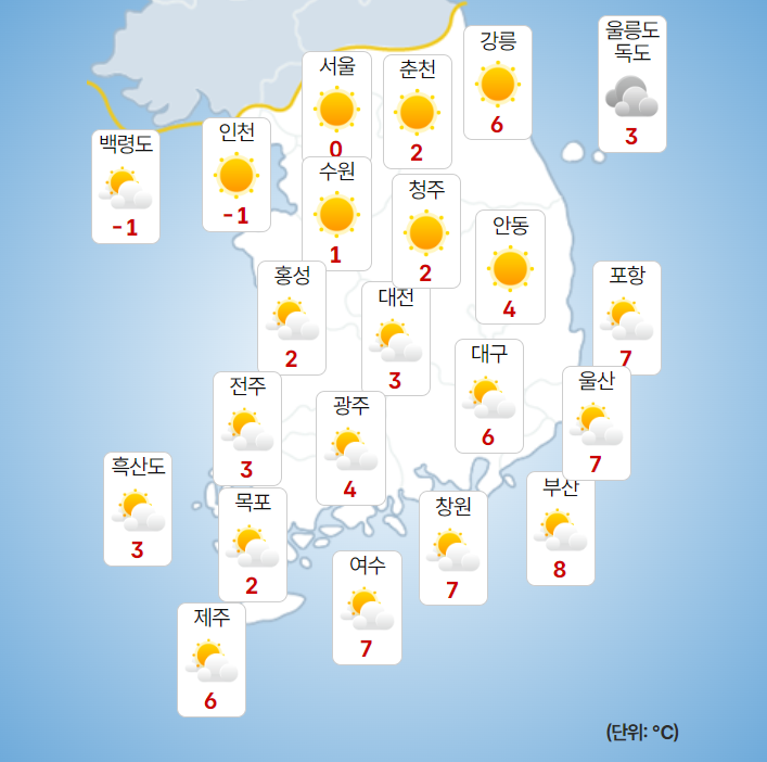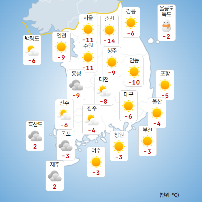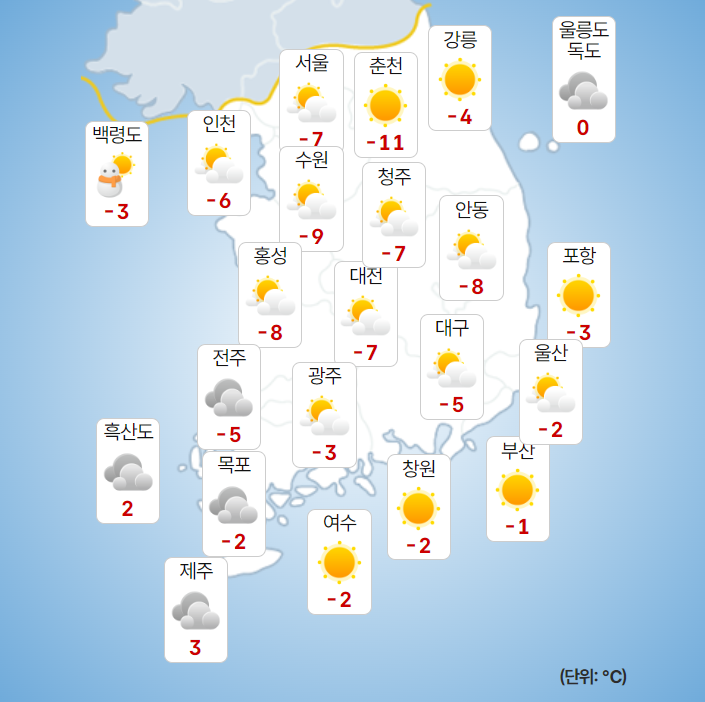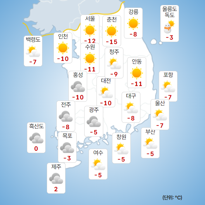 ▷ 당분간 중부지방을 중심으로 아침 기온이 -10℃ 안팎을 보이면서 매우 춥겠고, 바람도 강해 체감온도는 더욱 낮겠습니다.