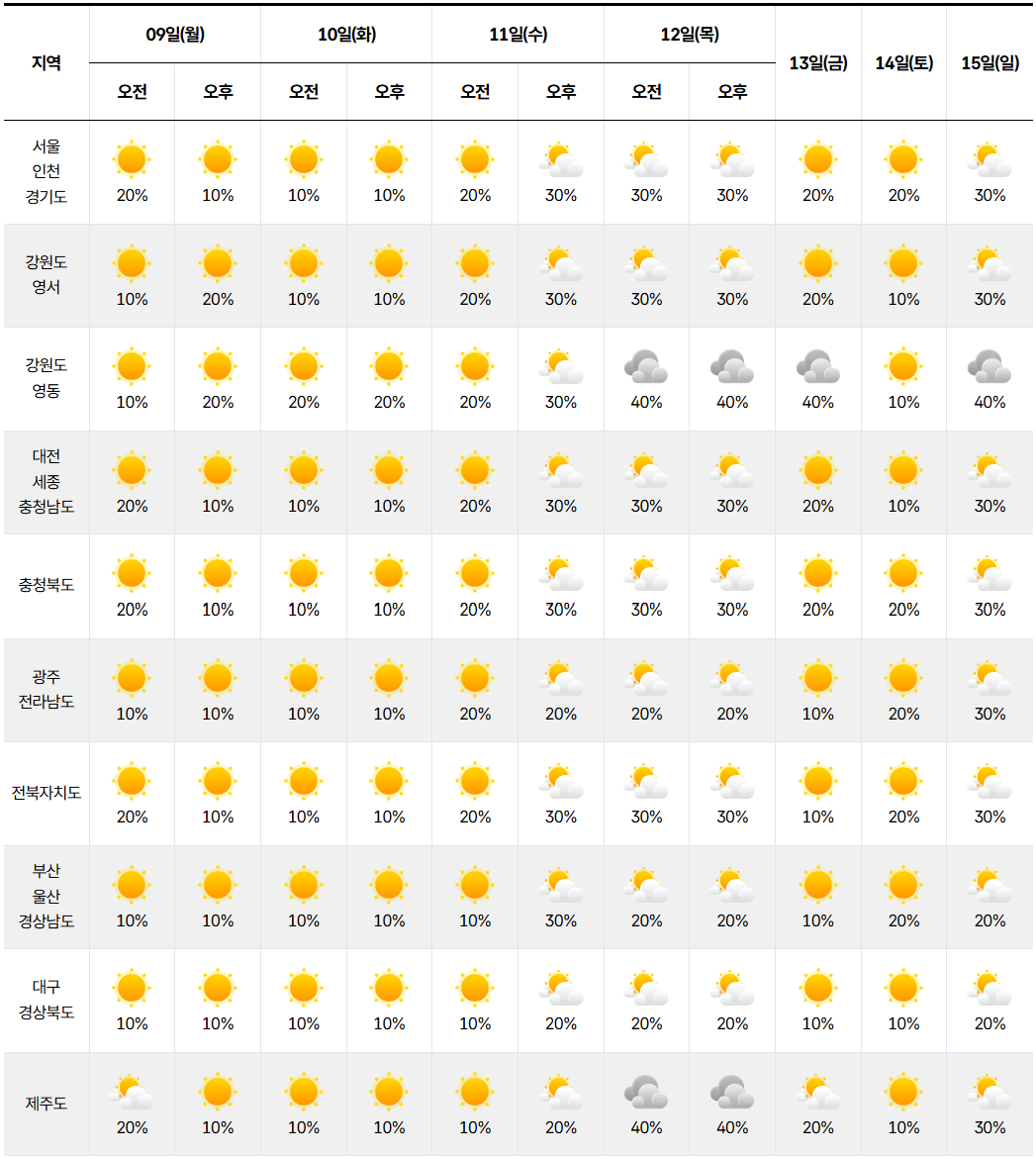 | 제주도 | 맑음 10% |