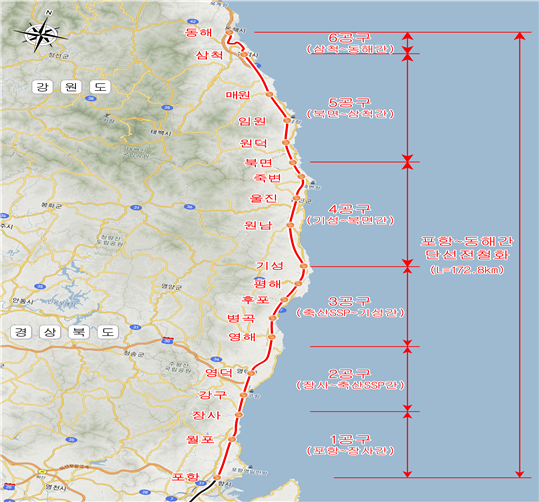 -기존 동해선 중 유일한 포항~동해 간 비전철 구간을 전철화하기 위해 총 6개 공구로 분할 발주하여 시행됨