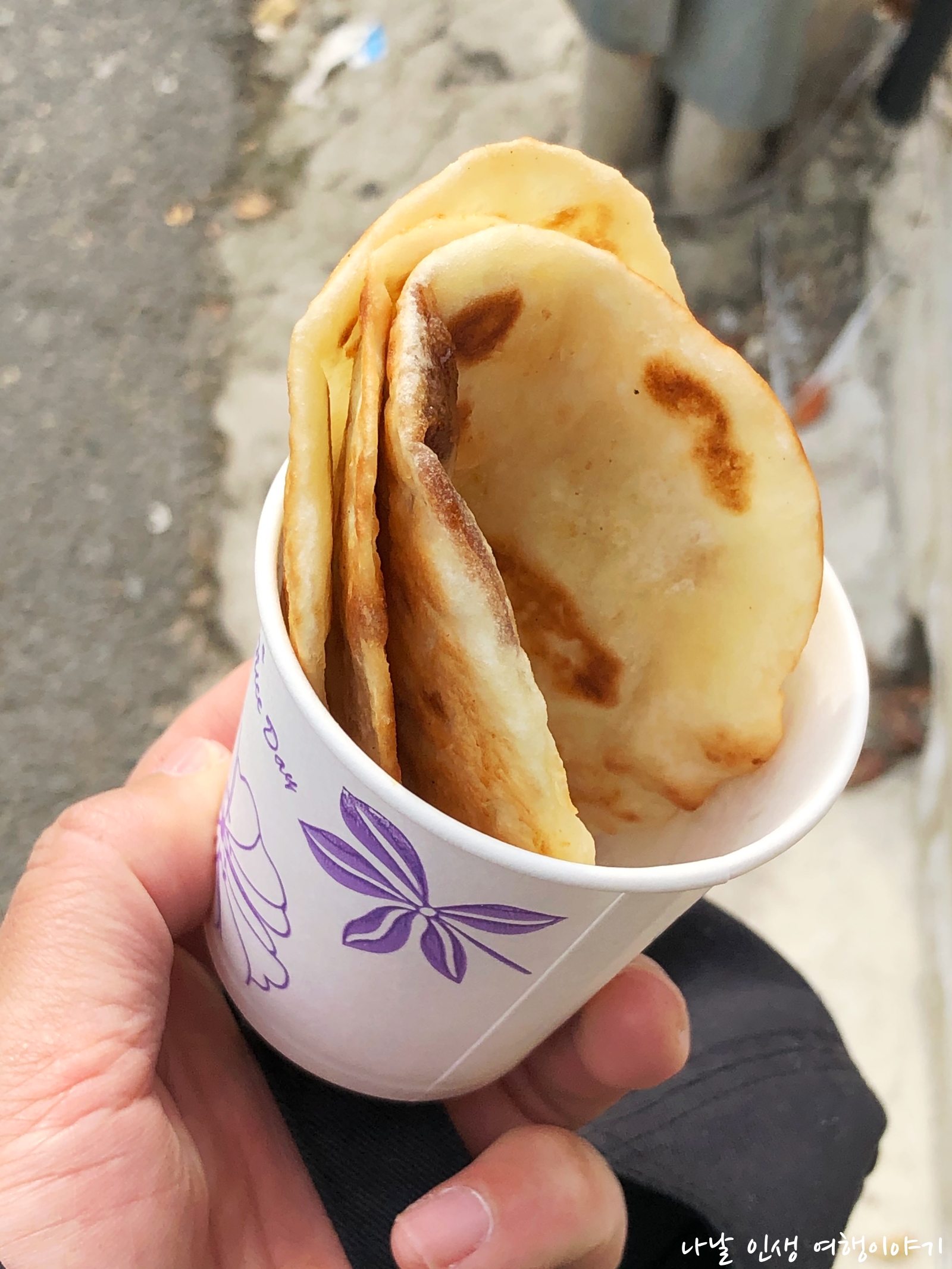호떡이 얇고 작으며 기름이 덜 묻는다. 그리고 맛있다!