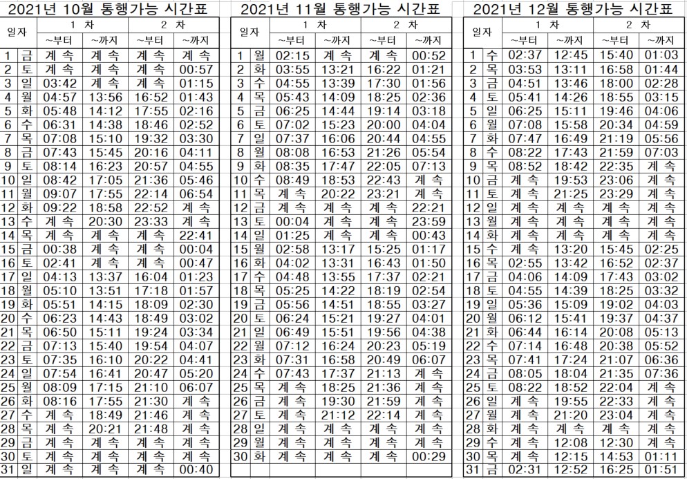 -위 표에 '계속'이라고 쓰여 있으면 다음 시간이 나올 때까지 통행이 계속 가능합니다.