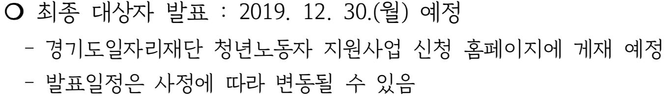 최종 대상자 발표는 2019년 12월 30일 날 경기도 일자리 재단 청년 노동자 지원사업 신청 홈페이지에서 확인이 가능합니다.