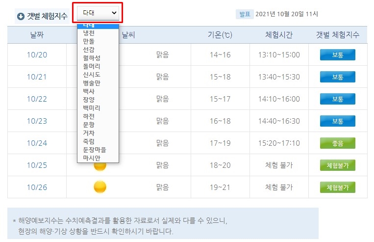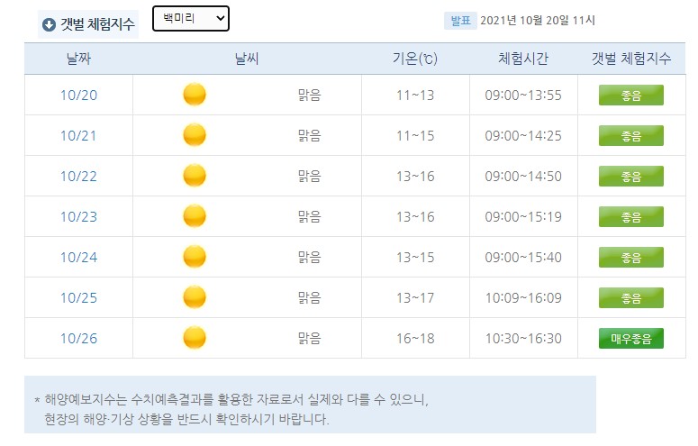 6) 갯벌체험을 희망하는 지역의 갯벌체험지수, 날씨, 기온, 체험가능시간 등을 자세히 살펴보기(예: 백미리)