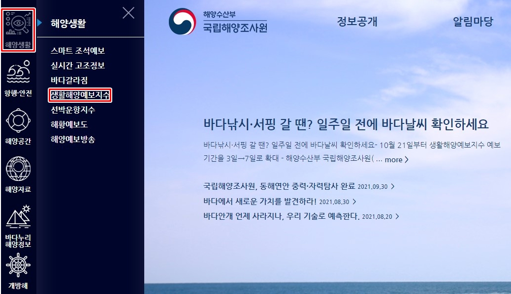 2) 옆 사이드 메뉴 중 '해양생활' 클릭 → '생활해양예보지수' 클릭하기