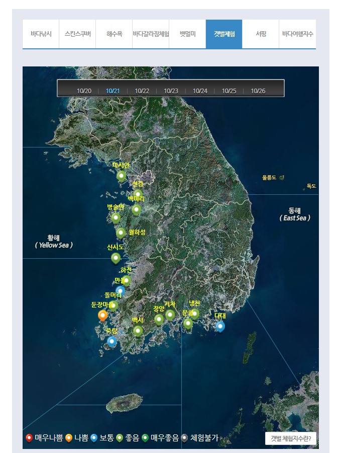 그런데 이러한 절차를 거치기 않고 한 번에 우리나라에 운영되고 있는 다수의 갯벌체험장의 물때 체험 가능시간 갯벌체험지수를 알아볼 수 있는 편리한 방법이 있습니다.