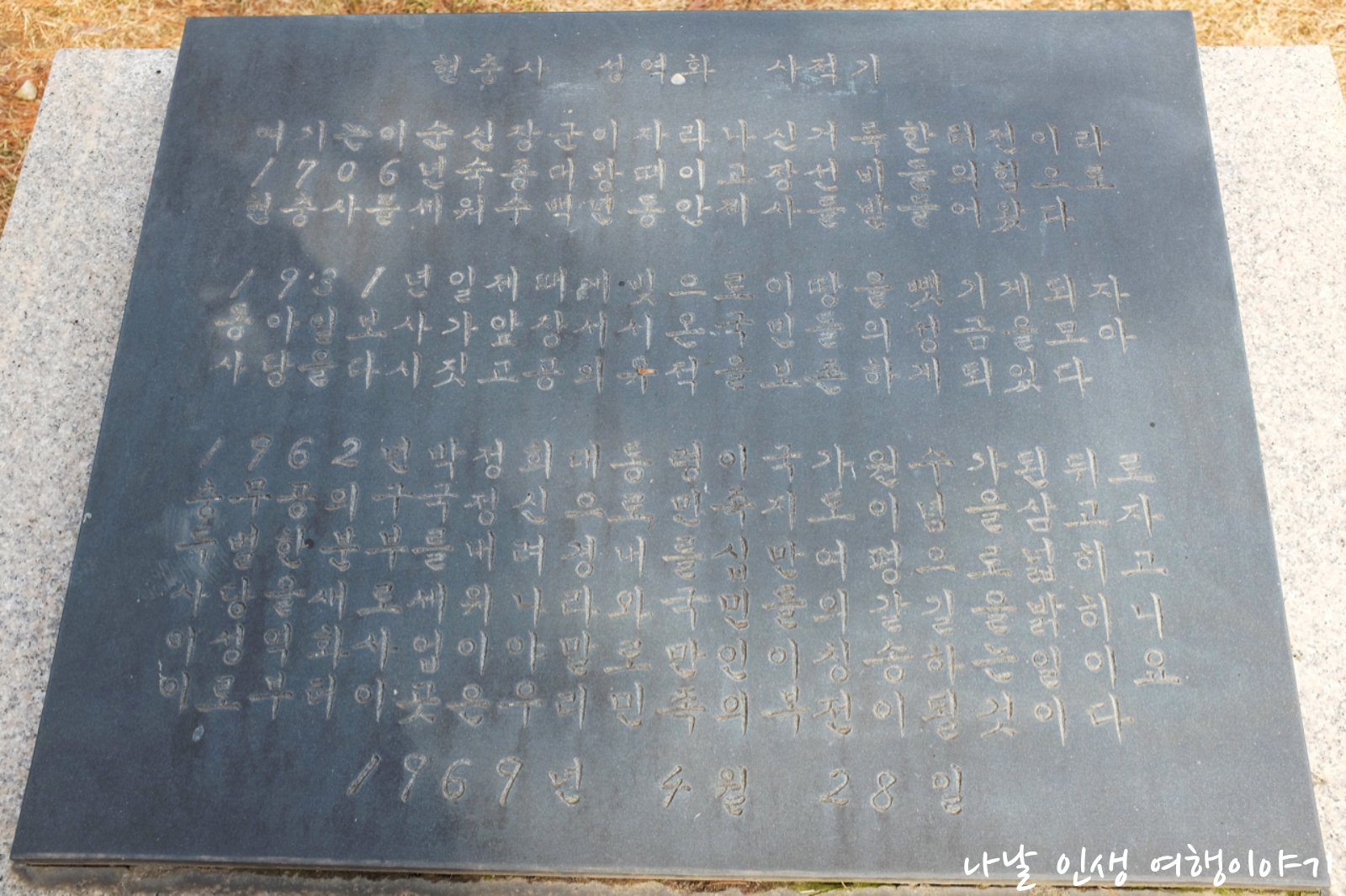 이 곳은 1967년에 조성된 곳이고 1932년에 동아일보가 주관하여 여러 사람들의 도움으로 만든 현충사는 근처에 건물만 있습니다.