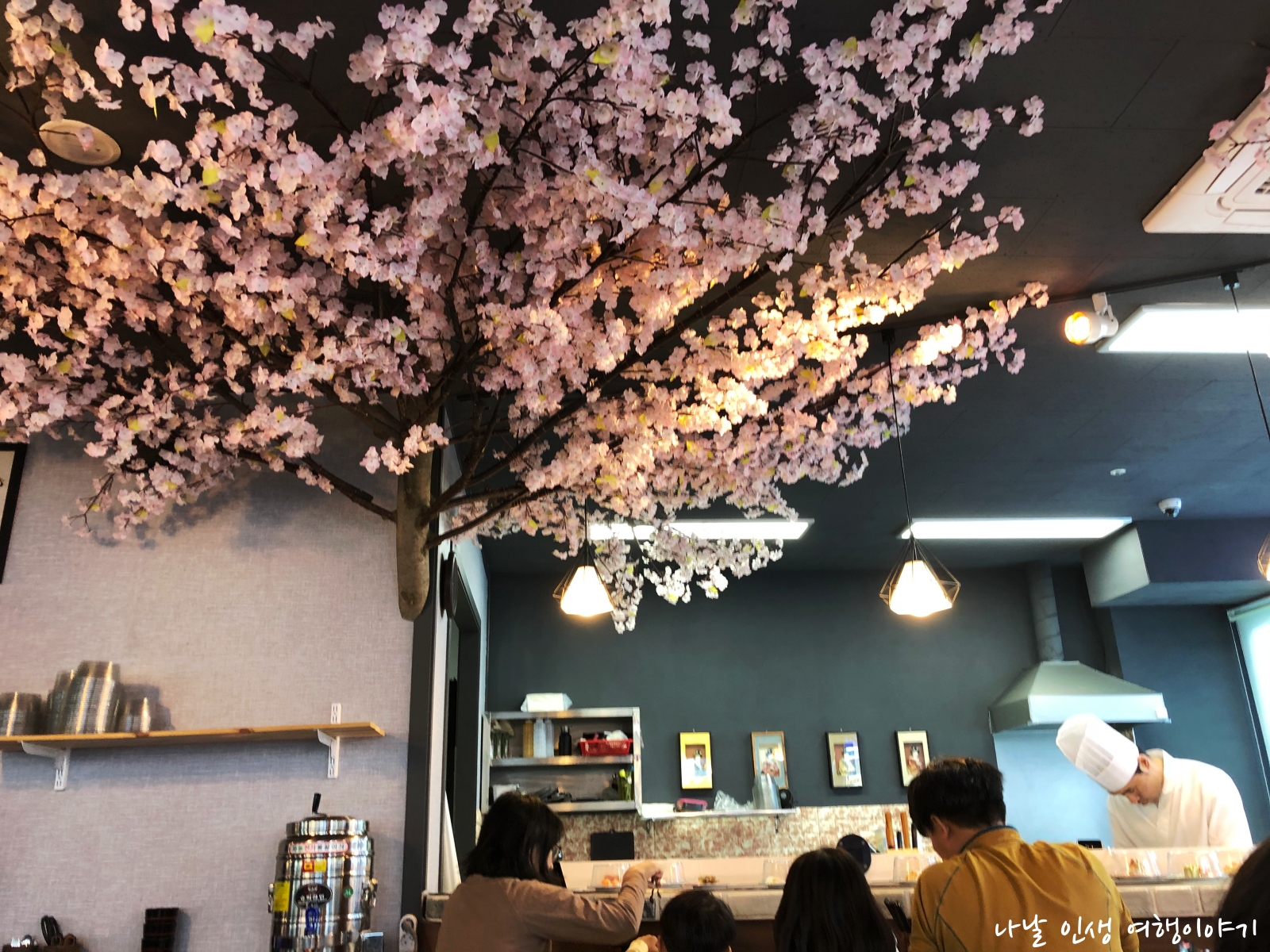 스카이 명장 가게 내부는 조리하는 공간 뒤로 벚꽃 모형이 예쁘게 자리하고 있습니다.