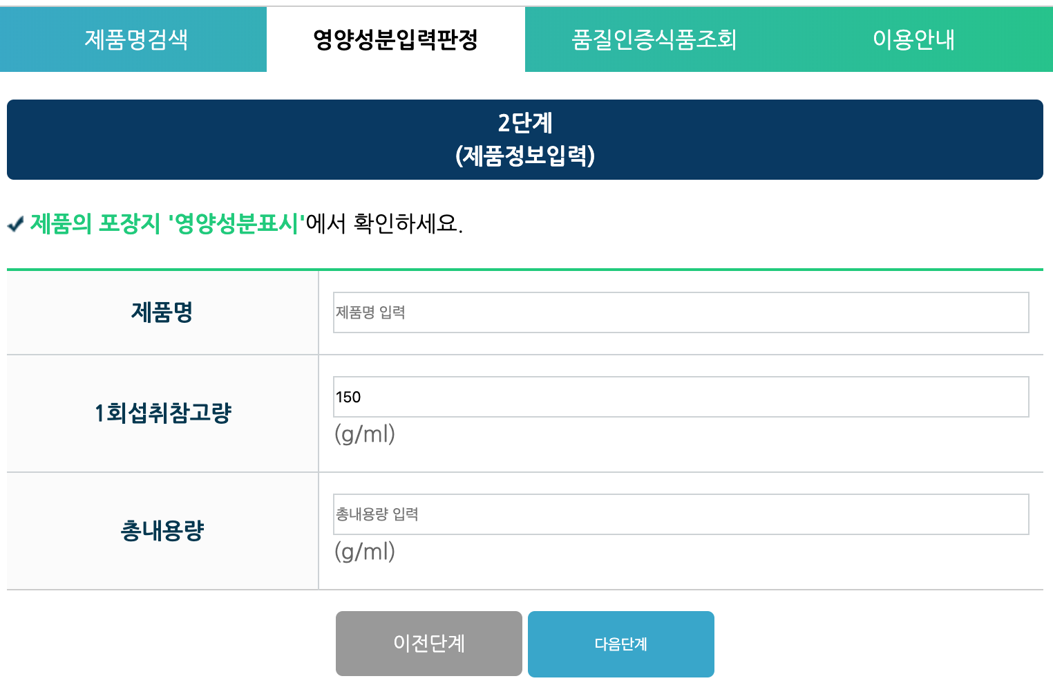 2) 제품의 '영양성분표시'에 나와 있는 제품 정보를 확인하여 2단계 화면에 입력합니다.(2단계)